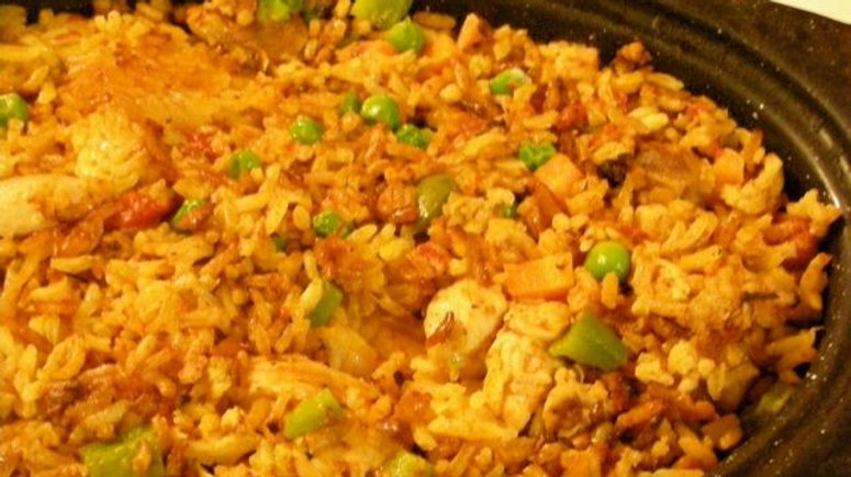 - Cover the pot and cook the mixture over a low heat until the rice is done and the vegetables are tender (maybe half an hour). Stir gently occasionally and check to see that the bottom of the pot does not become completely dry. Add warm water or broth (a quarter cup at a time) as necessary to help rice cook. Adjust seasoning as needed. If desired, add one of the meat add-ins while the dish is cooking. (Shrimp cook very quickly and should not be over-cooked or they will become tough; ham can be added at any time.)